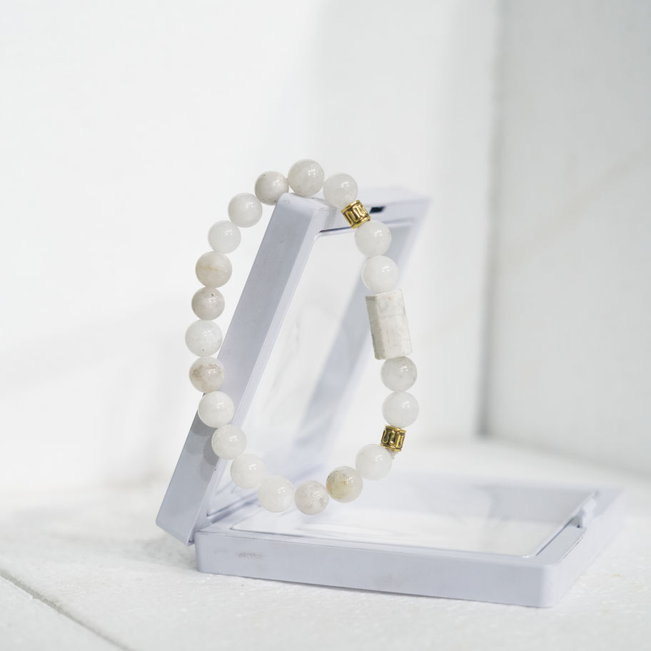 Discover the soothing energy of the Moonstone, known as the Stone of Inner Growth & Strength. This elegant bracelet is beautifully crafted with polished white moonstone beads, highlighted with a cylindrical centerpiece and golden spacers, giving it a graceful and divine appeal.