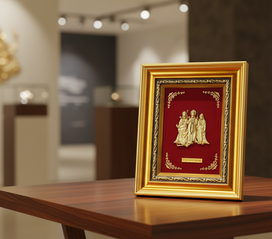 Bring home the blessings of Ayodhya with our exquisite Divine Ram Darbar Golden Embossed Frame. This stunning piece features a finely detailed depiction of Lord Rama, Sita, Lakshmana, and Hanuman, crafted with a beautiful golden embossed finish that radiates spiritual grace.